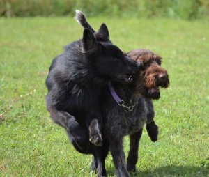 Inte riktogt lika varmt idag som tidigare "bara" 29 grader i skuggan. Korthåriga vorstehn Armani och bruna labben Henna får röja lite i rasthagen.